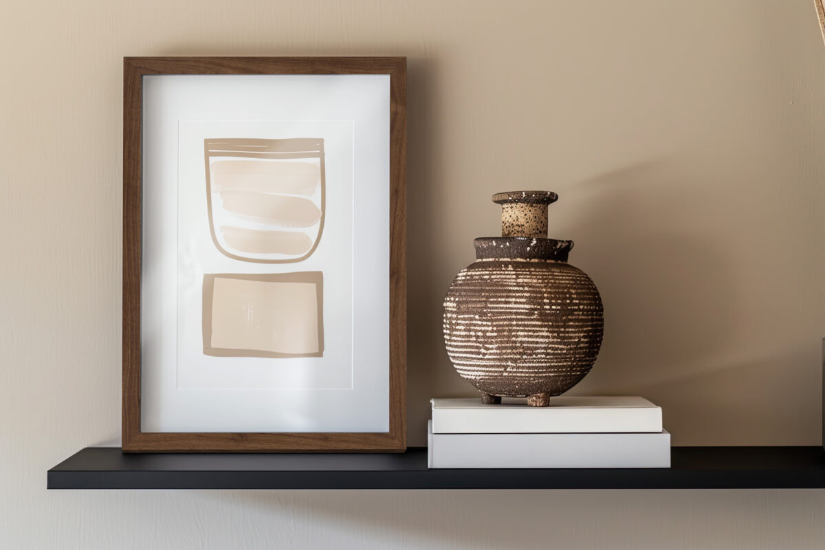 Eleganckie wykończenie o głębokiej, ciemnobrązowej tonacji, która emanuje spokojem i klasycznym stylem. Jego powierzchnia charakteryzuje się bardzo wyraźnym, pionowym usłojeniem z łagodnymi, falistymi liniami, które płynnie przechodzą między różnymi odcieniami czekoladowego brązu. W rysunku drewna dostrzec można nieliczne, subtelnie wkomponowane sęki, które dodają oprawie autentyczności i szlachetnego charakteru. Dzięki swojej nasyconej barwie i harmonijnej strukturze, dekor ten idealnie sprawdza się w reprezentacyjnych wnętrzach, biurach oraz klasycznych salonach, stanowiąc solidne i prestiżowe obramowanie dla eksponowanych prac.